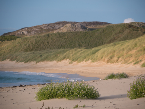 Typically, dune systems made of lime-rich shell sand promote the widest range of plants. In the summer, fixed dunes are dotted with clovers, lady’s bedstraw, pyramidal orchid, kidney vetch and carline thistle. Prickly saltwort, sea rocket, oraches or sea sandwort growing along the strandline are good indicators of a healthy sand dune system.