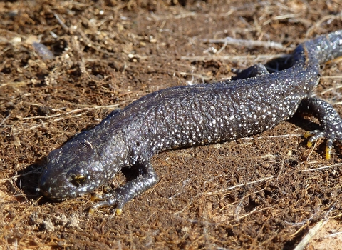 Our biggest newt, the great crested newt is almost black in colour, with spotted flanks and a striking, orange belly. It has warty skin and males have a long, wavy crest along the body and tail during the breeding season.