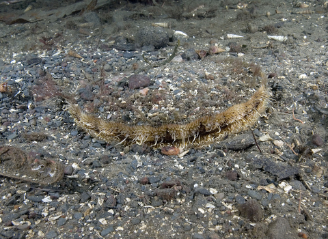 Great scallops are a large bivalve mollusc, its shell familiar to us all with its radiating ridges and characteristic scallop wings by the hinge. The 2 shells are actually different: one is curved like a bowl and the upper shell is flat like a lid. They live in a self-dug hollow on sandy or gravelly seabeds and are filter feeders, filtering out plankton and other micro-organisms. Scallops are a favourite food of starfish, but can actually swim out of harm's way by rapidly opening and shutting their shells, sending out jets of water which propel them over short distances.